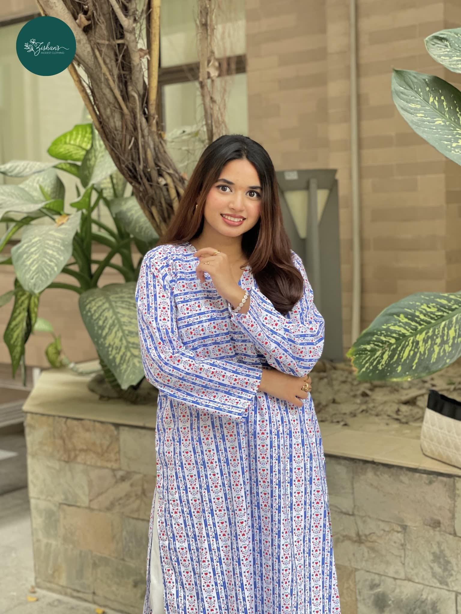 Beautiful blue and red striped floral printed modest kurta on white base. Made from soft premium lawn fabric. Comfortable fit with elegant look, perfect for daily wear and occasions. **Product Details:** ➤ Fabric: Premium Lawn ➤ Print: Blue Red Striped Floral ➤ Fit: Modest & Comfortable **Care Instructions:** ➤ Cold wash (30°C) ➤ Hang dry in shade ➤ Iron on low heat from reverse side