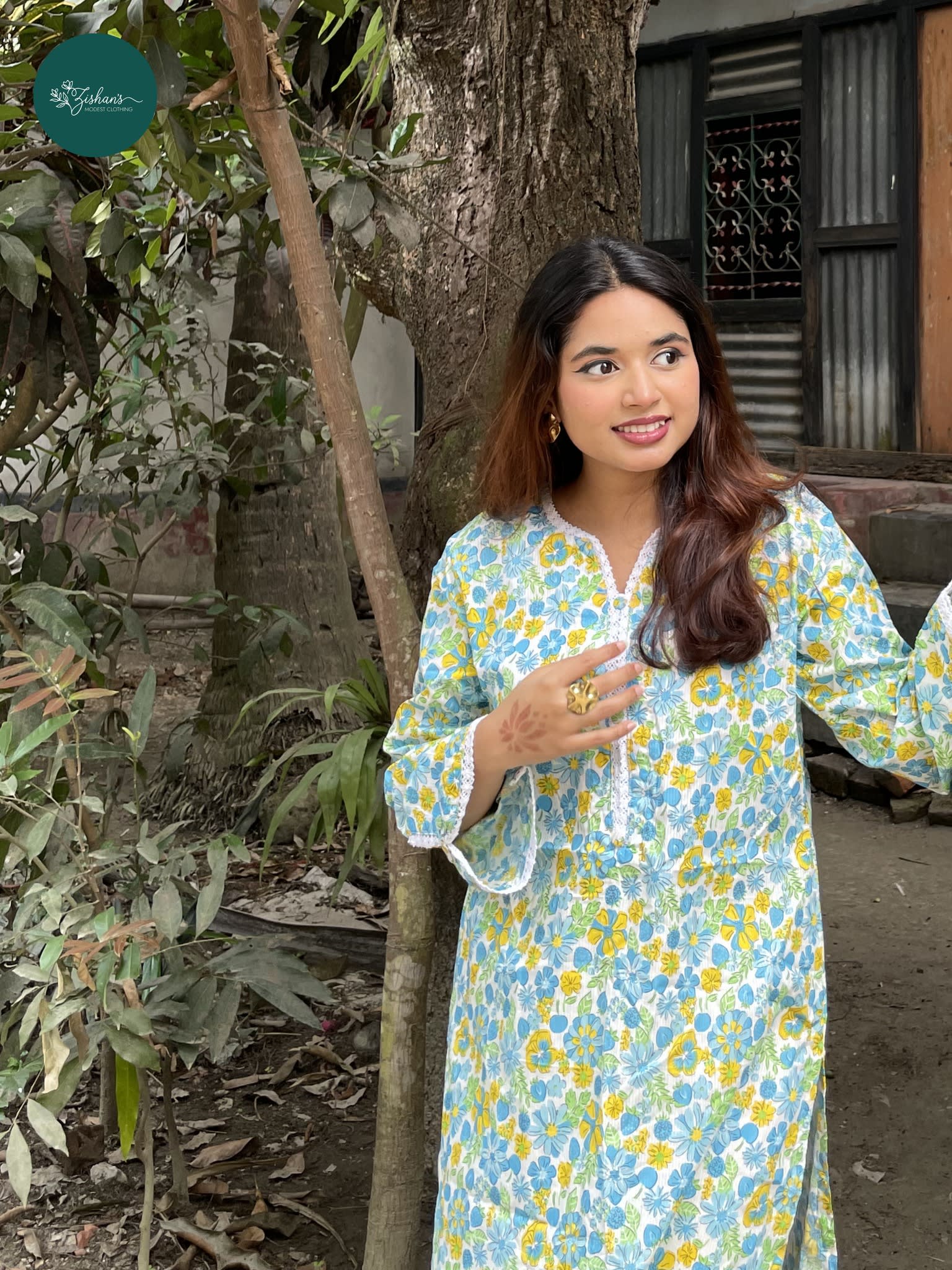 Elevate your everyday elegance with this beautiful floral printed modest kurta from Zishan’s Modest Clothing. Featuring a fresh white base with vibrant blue and yellow flower prints, it gives a graceful and feminine look. Crafted from premium soft lawn fabric, this kurta offers excellent comfort and breathability all day long. The delicate white lace detailing on the neckline and sleeve cuffs adds a premium and elegant finishing touch. Its modest length, relaxed fit, and full sleeves make it ideal for daily wear, office, casual outings, and special occasions. **Product Details:** ➤ Fabric: Premium Lawn ➤ Print: Digital Floral (Blue & Yellow) ➤ Design: Lace work on neckline & cuffs ➤ Fit: Modest & Comfortable ➤ Gender: Women **Care Instructions:** ➤ Hand wash or machine wash in cold water (30°C or below) ➤ Use mild detergent, avoid bleach ➤ Wash separately or with similar colors ➤ Hang dry in shade, do not tumble dry ➤ Iron on low heat from the reverse side A perfect combination of comfort, style, and modesty. A must-have piece for your wardrobe!