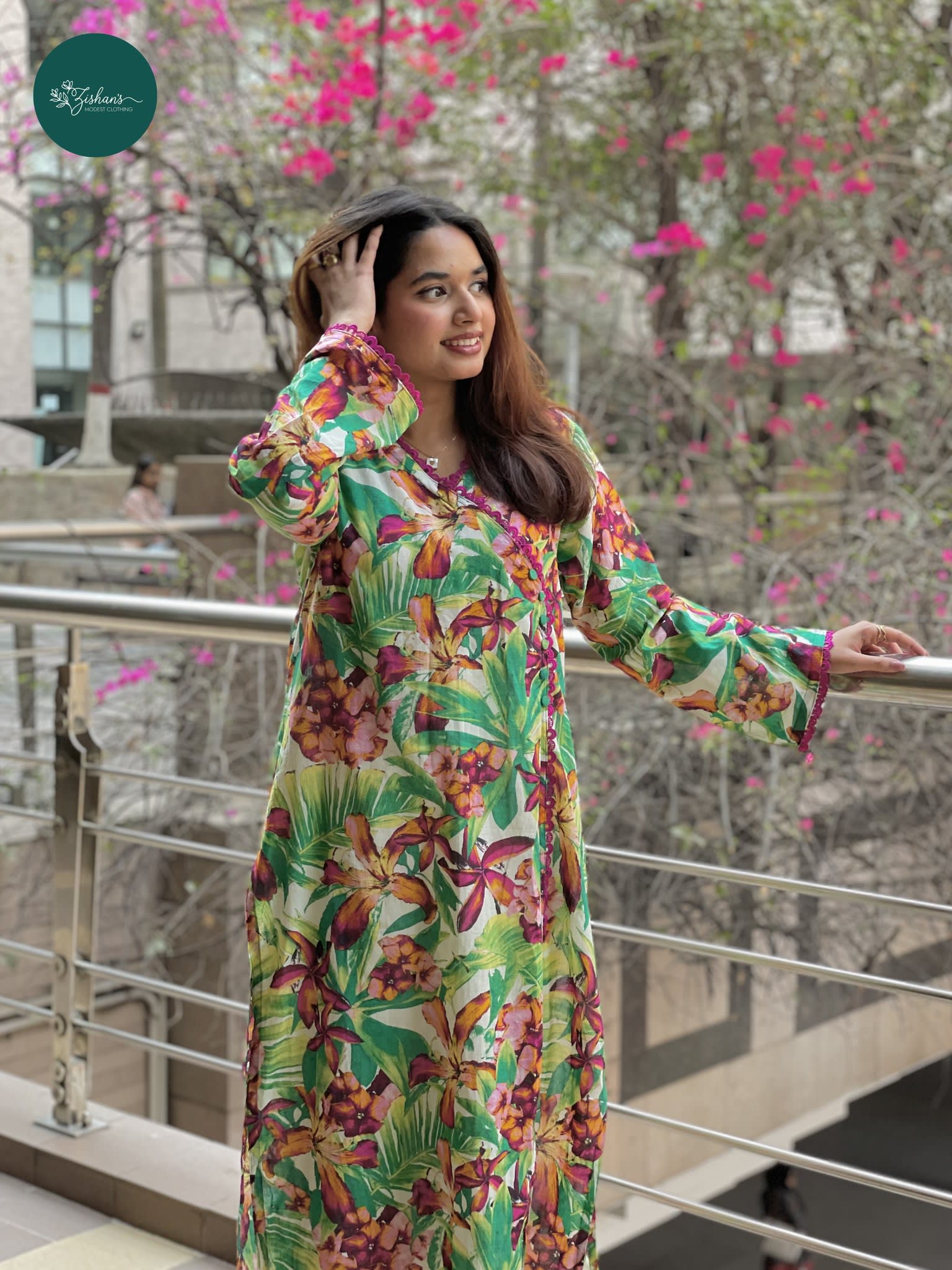 Vibrant tropical floral printed modest kurta with bold green leaves and purple-orange flowers. Made from soft premium lawn fabric with pretty pink scalloped lace detailing. Comfortable fit and stylish look, perfect for daily wear and occasions. **Product Details:** ➤ Fabric: Premium Lawn ➤ Print: Tropical Floral (Green & Purple) ➤ Design: Pink scalloped lace ➤ Fit: Modest & Comfortable **Care Instructions:** ➤ Cold wash (30°C) ➤ Hang dry in shade ➤ Iron on low heat from reverse side